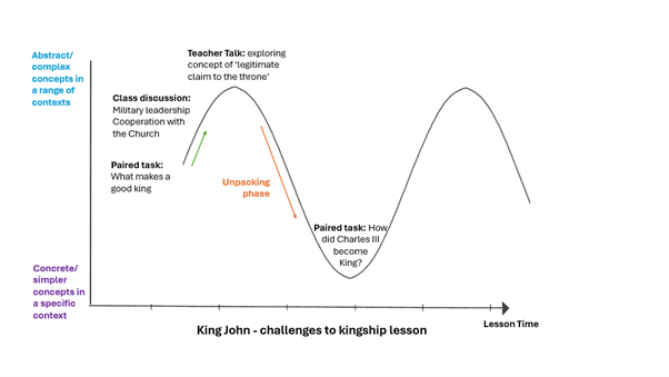 For many new teachers, the aim might be to get pupils to identify all the key qualities of being a good medieval king and noting them down. A more experienced teacher however might recognise that a concept like ‘legitimacy’ requires simplification for pupils to grasp it. They might for example bring up the concept, then immediately move to getting pupils to think about how the current King was enabled to ascend to the throne. In this case pupils are moved from the abstract concept of legitimacy to the concrete example of a single king’s claim. This moves the content much lower on the semantic wave, aiming to give an access point for pupils.
